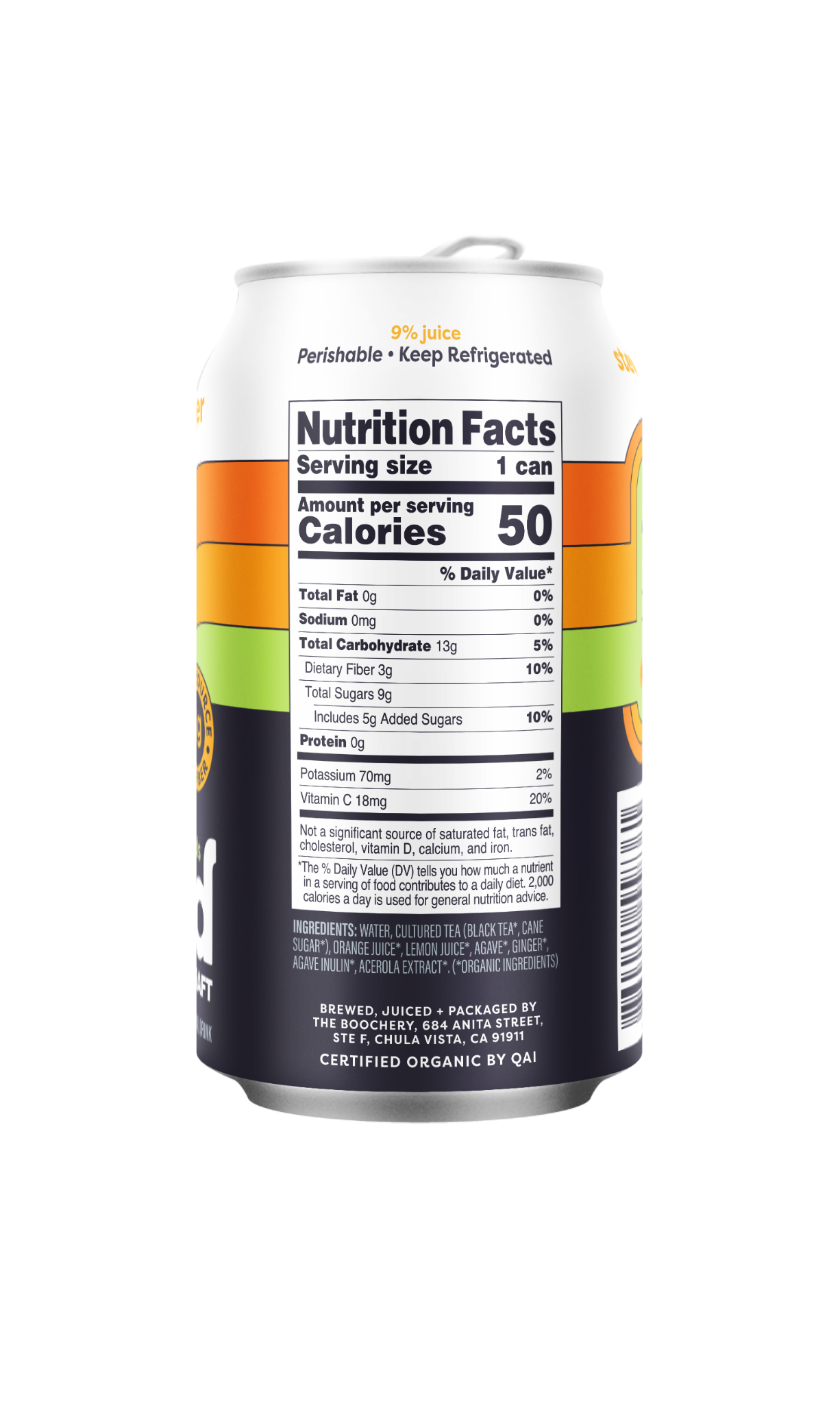 Ingredients: Water, Cultured Tea (Black Tea*, Cane Sugar*), Orange Juice*, Lemon Juice*, Agave*, Ginger*, Agave Inulin*, Acerola Extract*. (*Organic Ingredients)