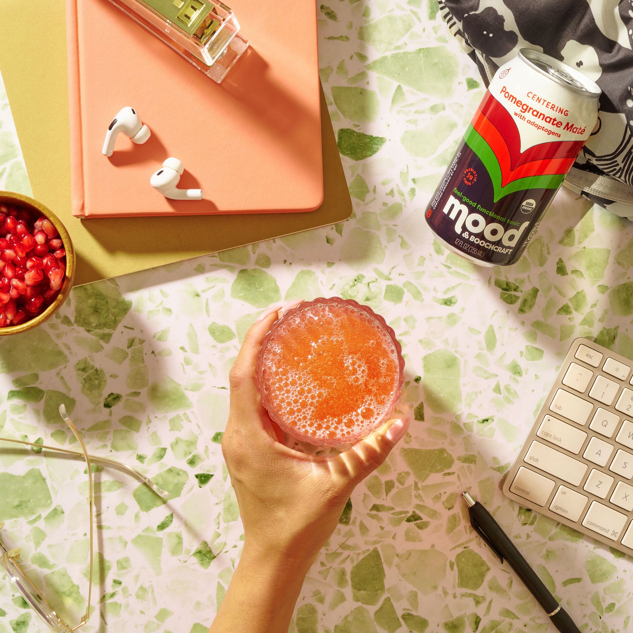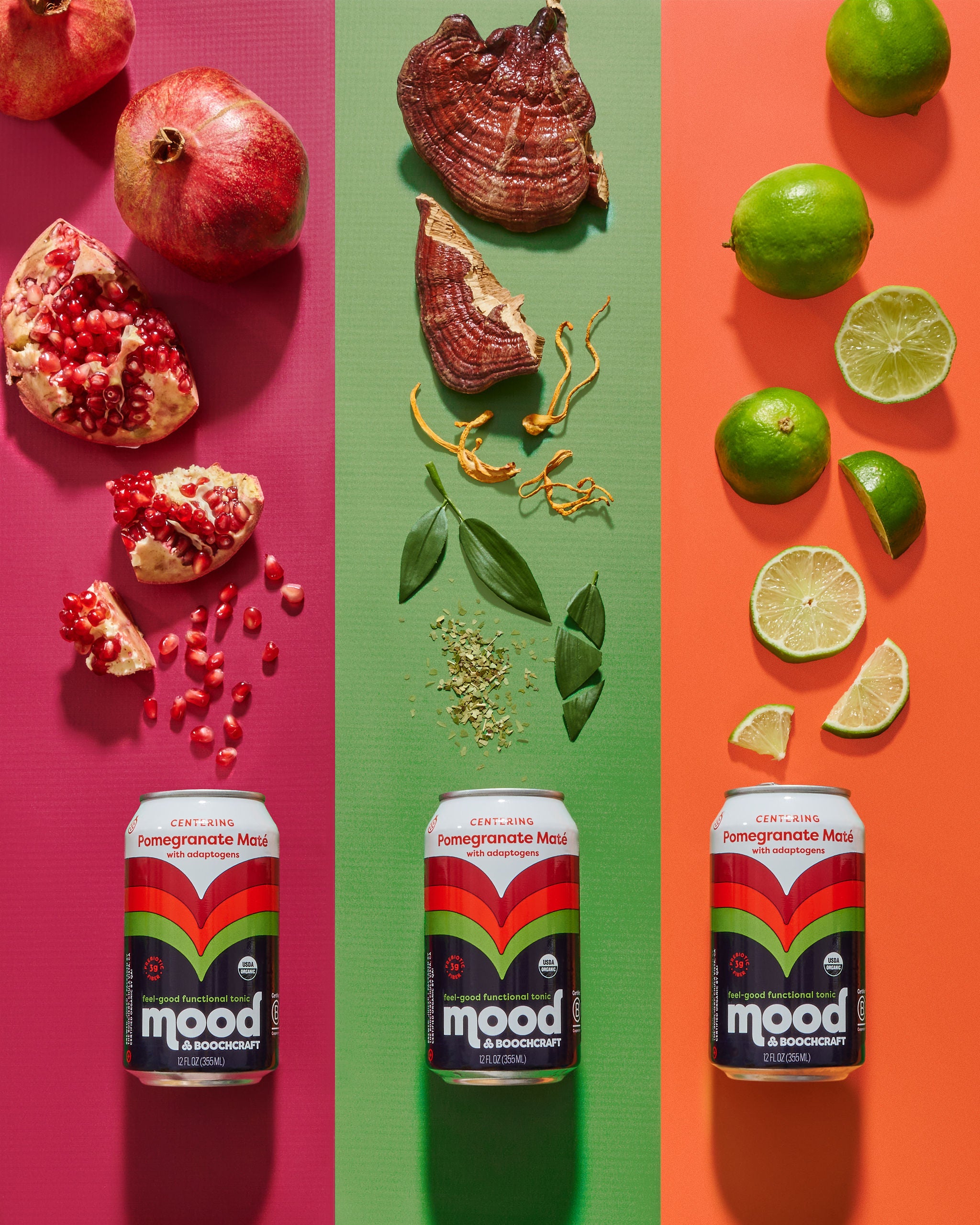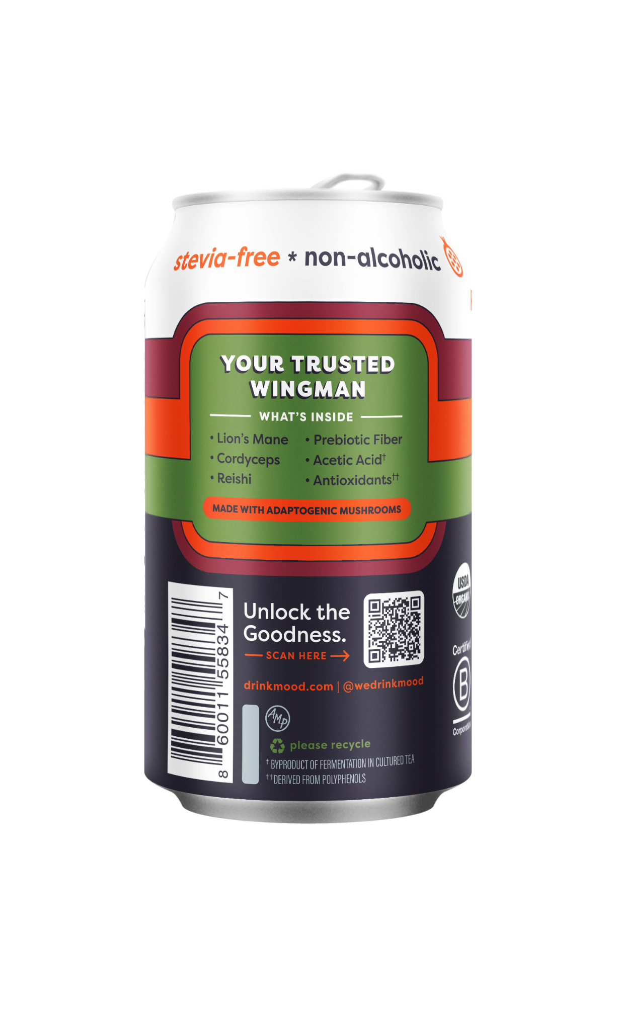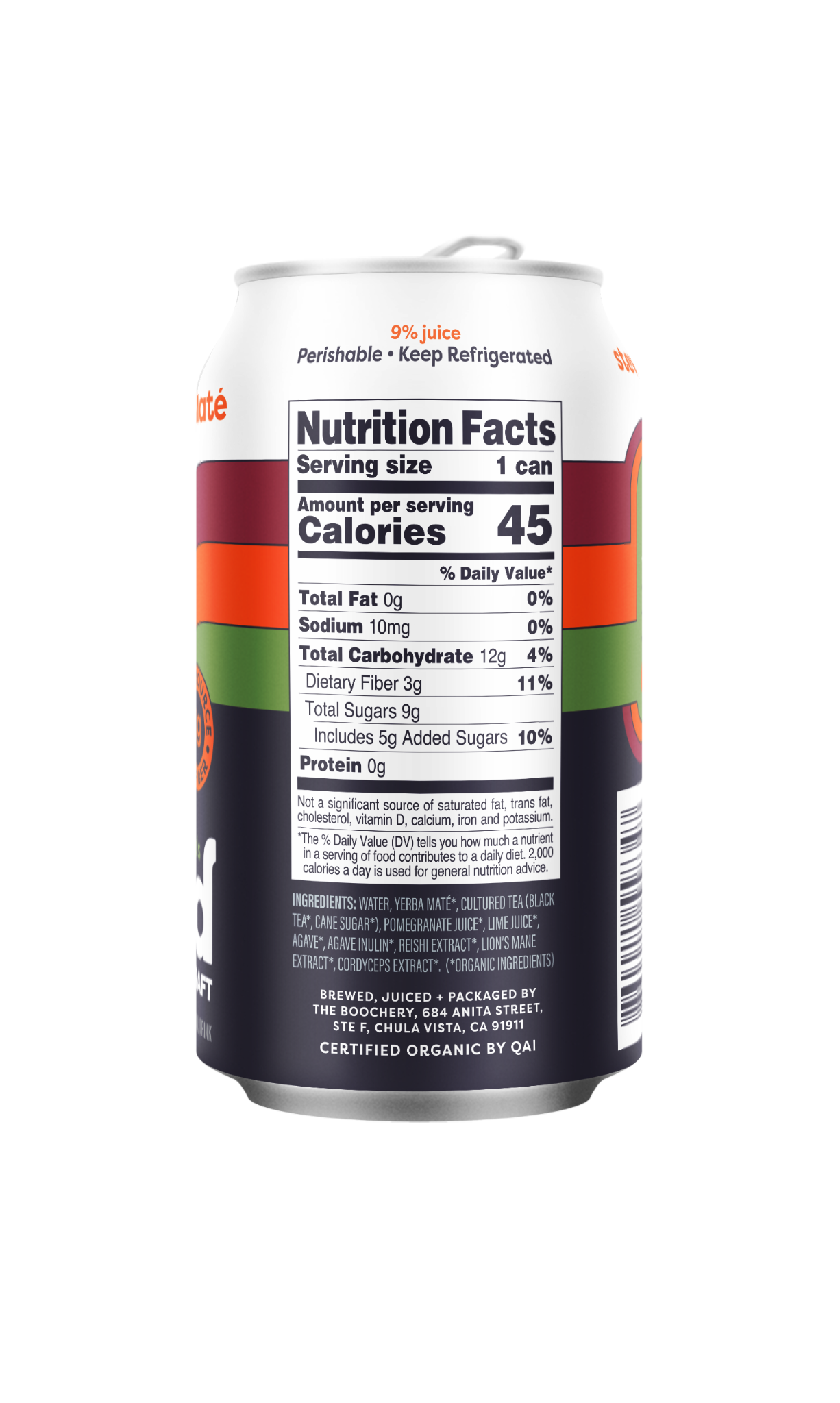 Ingredients: Water, Yerba Maté*, Cultured Tea (Black Tea*, Cane Sugar*), Pomegranate Juice*, Lime Juice*, Agave*, Agave Inulin*, Reishi Extract*, Lion's Mane Extract*, Cordyceps Extract*. (*Organic Ingredients)