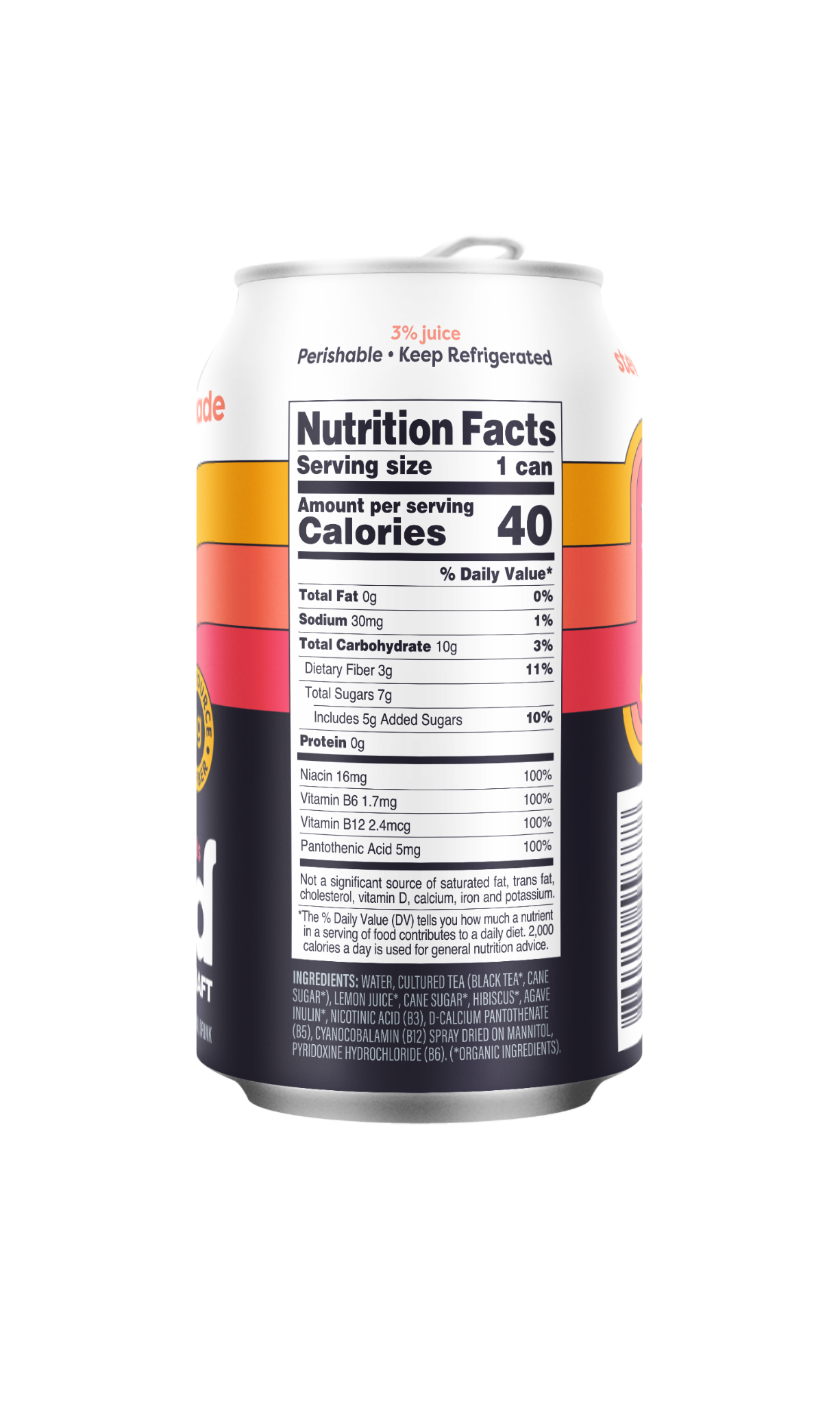 Ingredients: Filtered Water, Cultured Tea (Black Tea*, Cane Sugar*), Lemon Juice**, Cane Sugar**, Hibiscus*, Agave Inulin*, Nicotinic Acid (B3), D-Calcium Pantothenate (B5), Cyanocobalamin (B12) spray dried on Mannitol, Pyridoxine Hydrochloride (B6).